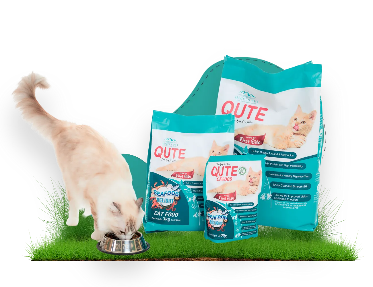 Resipi unik Qute Cat menonjolkan makanan daging ikan berkualiti tinggi yang diambil dengan segar. Bahan-bahan ini dicampurkan menjadi empat resipi yang kaya dengan nutrisi, menyajikan rasa yang sedap dan hidangan yang kaya dengan kesihatan. Qute Cat direka berdasarkan prinsip LID (limited ingredient diet), yang menggunakan hanya beberapa bahan berkualiti tinggi, yang menghasilkan tolerabiliti yang baik. Tambahan pula, makanan ini menyokong sistem imun semulajadi (serta melindungi sel-sel dari radikal bebas yang bertanggungjawab terhadap penuaan). Tentu saja, semua produk tidak mengandungi pewarna, perisa dan pengawet tiruan sama sekali.